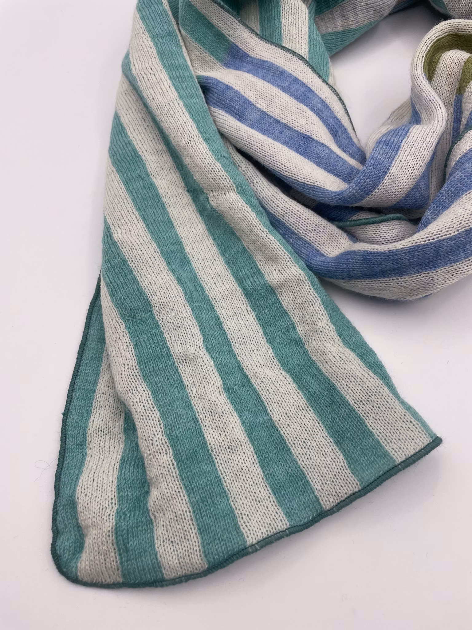 Unik halsduk i vår jacquardstickning. Vi använder restgarner från vår tygproduktion och därmed blir ingen halsduk den andra lik.