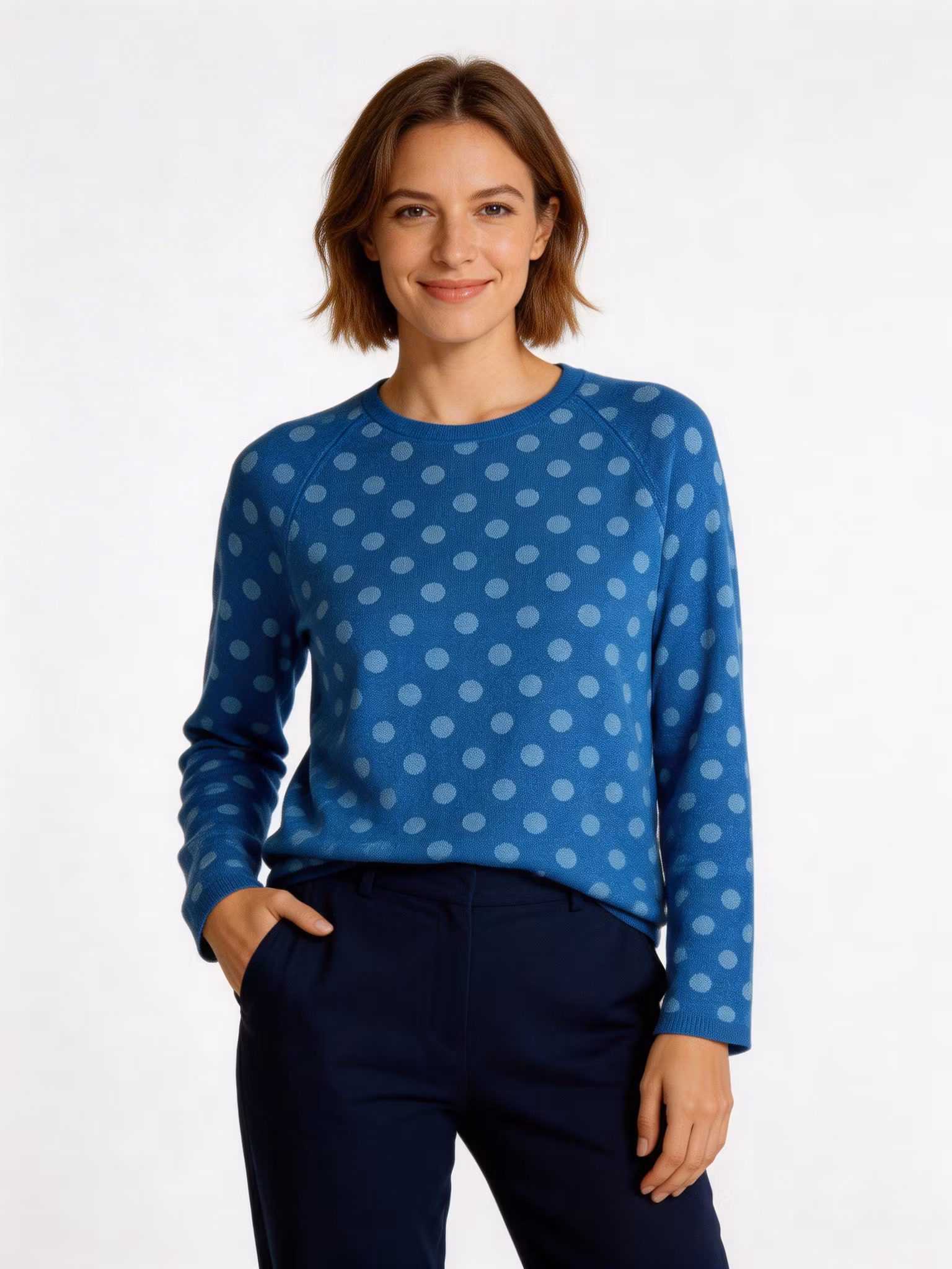Vår baströja Daisy, en rak modell, i jacquardstickning. I vårt mönster Prick i blå / aqua.