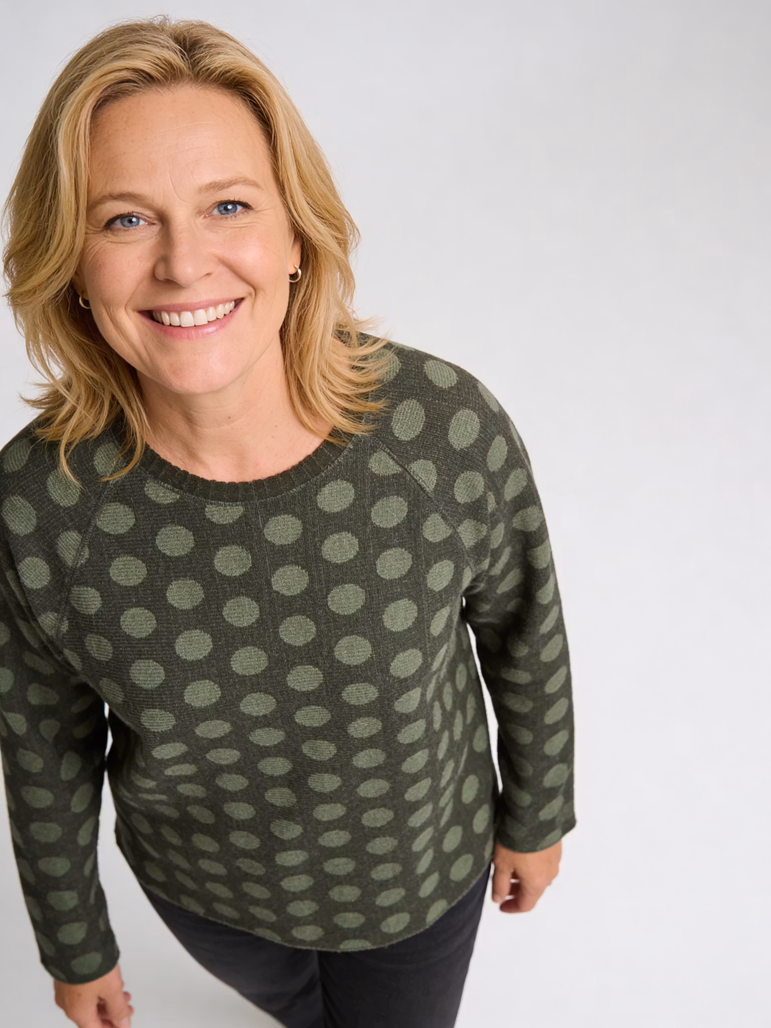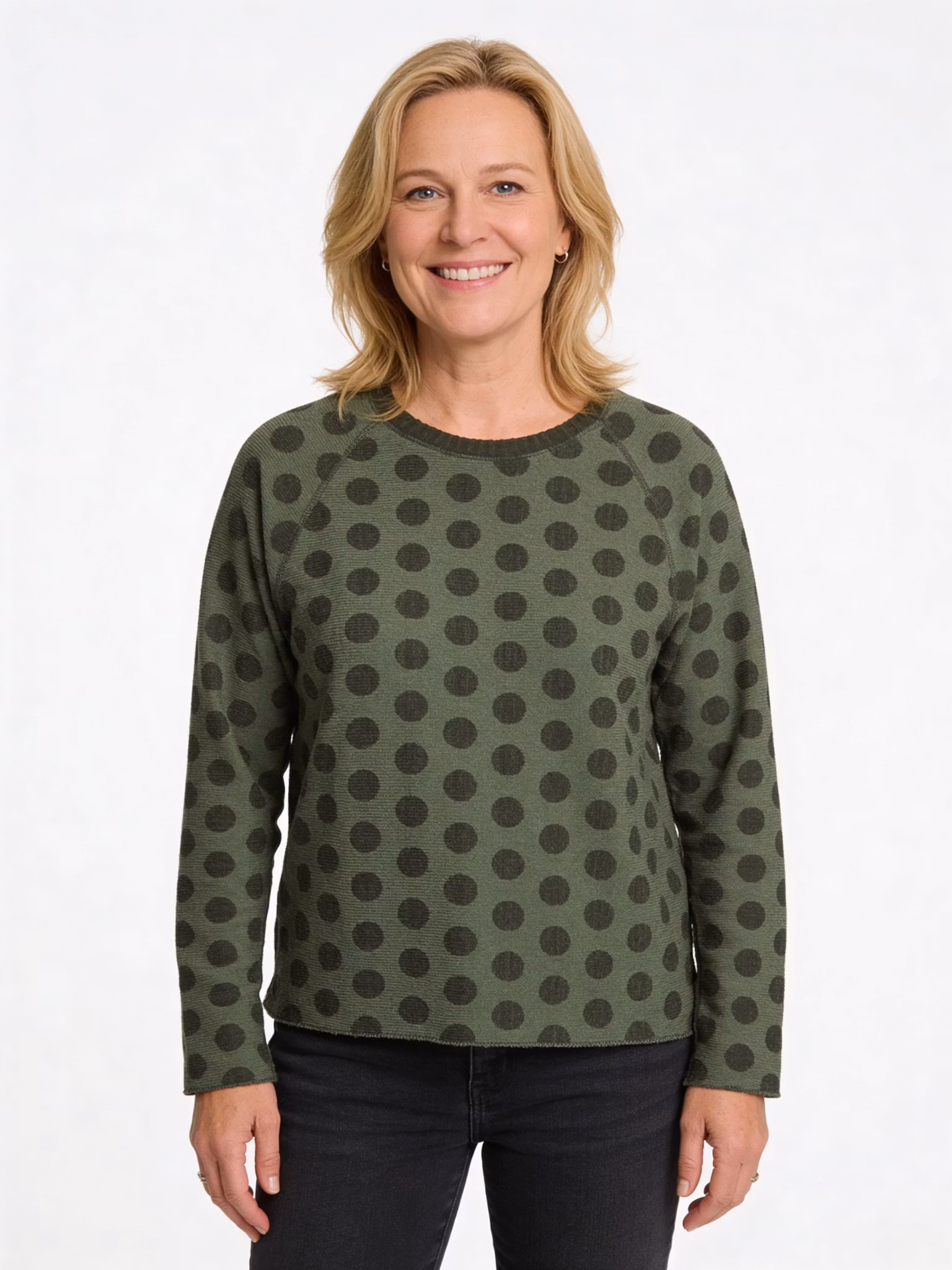 Vår baströja Daisy, en rak modell, i jacquardstickning. I vårt mönster Stor Prick i mossgrön / grönblå. 100% ull.