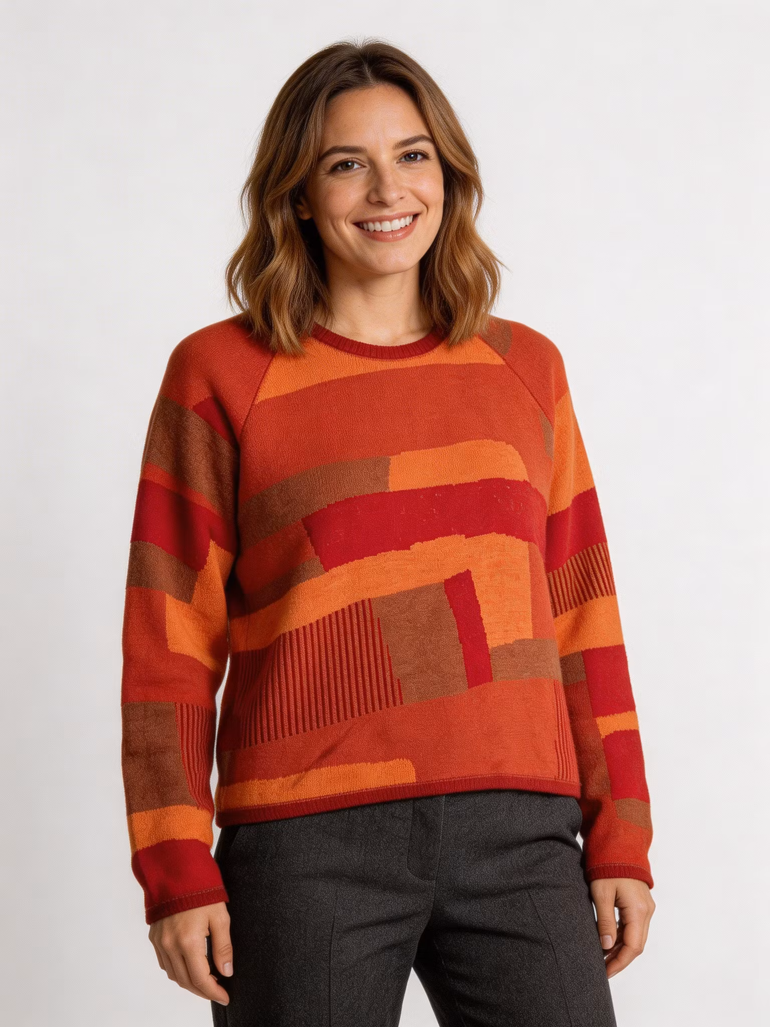 Vår baströja Daisy, en rak modell, i jacquardstickning. Varje tröja finns bara i ett exemplar stickat av restgarner från vår tygproduktion i ett slumpvis mönster vi döpt till Åker. 100% ull.
