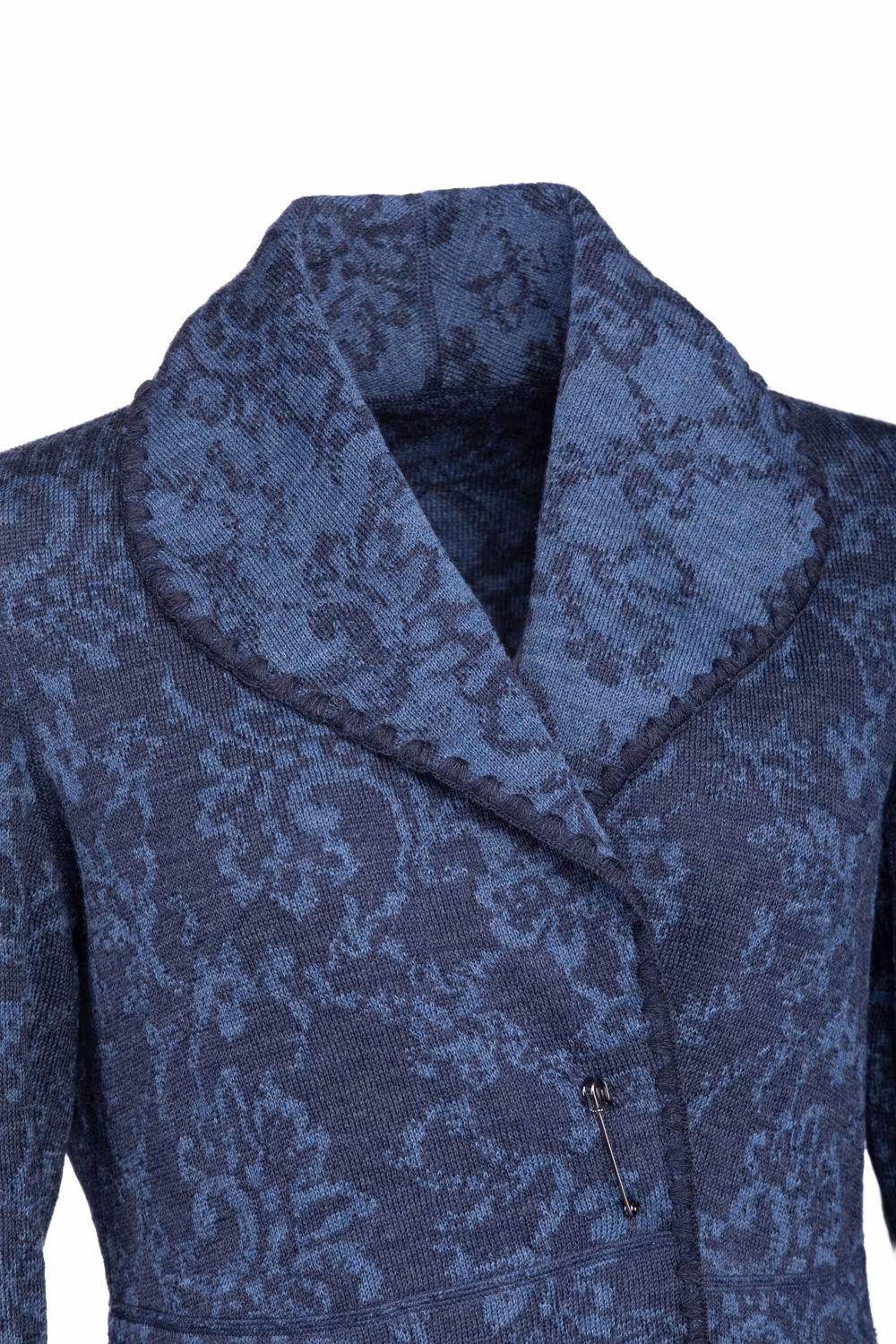 Koftjacka i jacquard, stängs med stor säkerhetsnål som medföljer.
