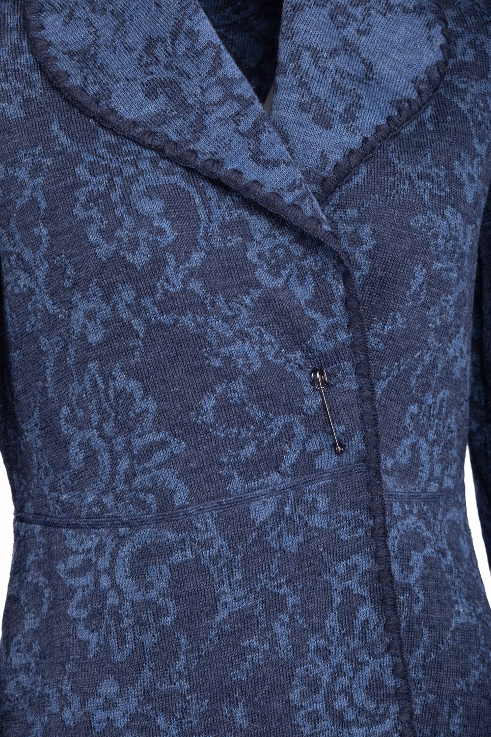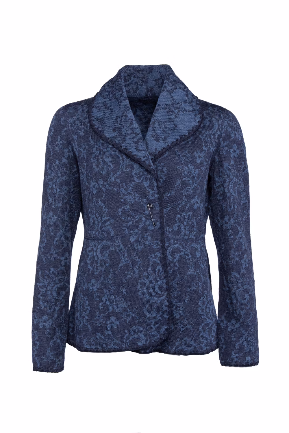 Koftjacka i jacquard, stängs med stor säkerhetsnål som medföljer.