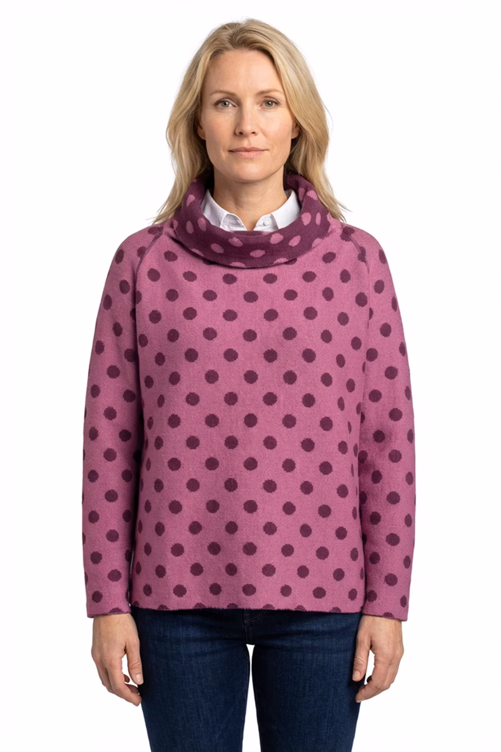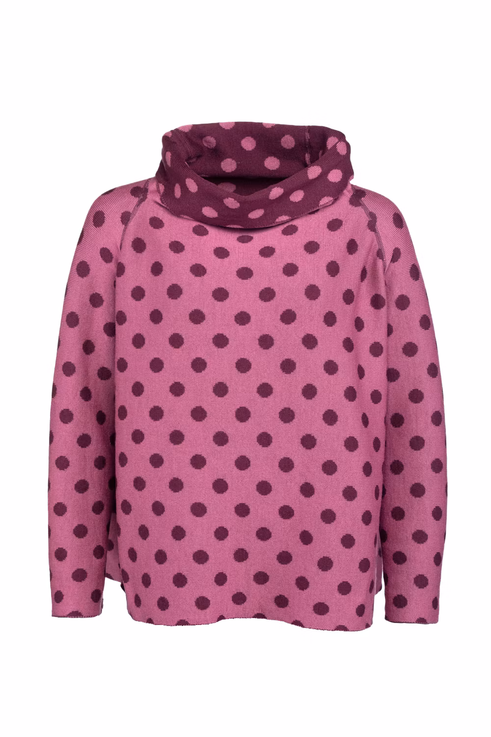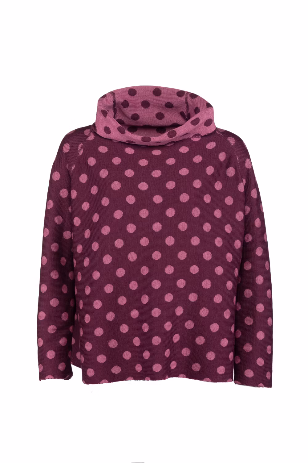 Vår storpolo Frida, en rak modell med mycket vidd, i jacquardstickning. I mönstret Prick i vinröd / ljung. 100% ull och vändbar.