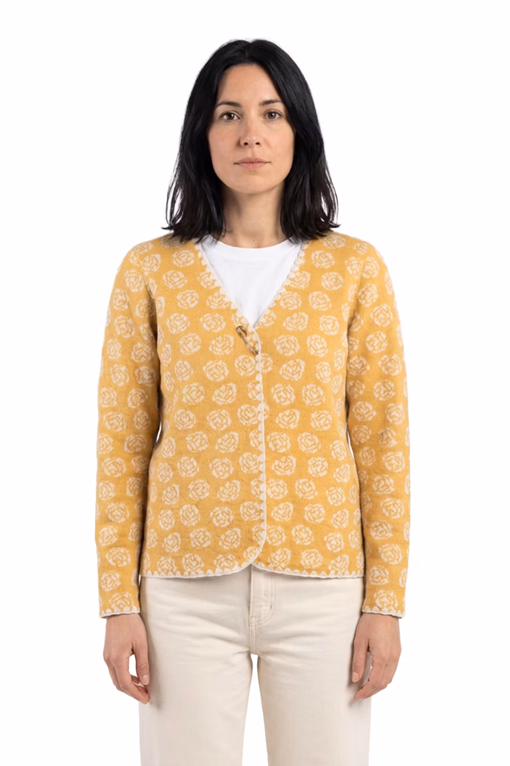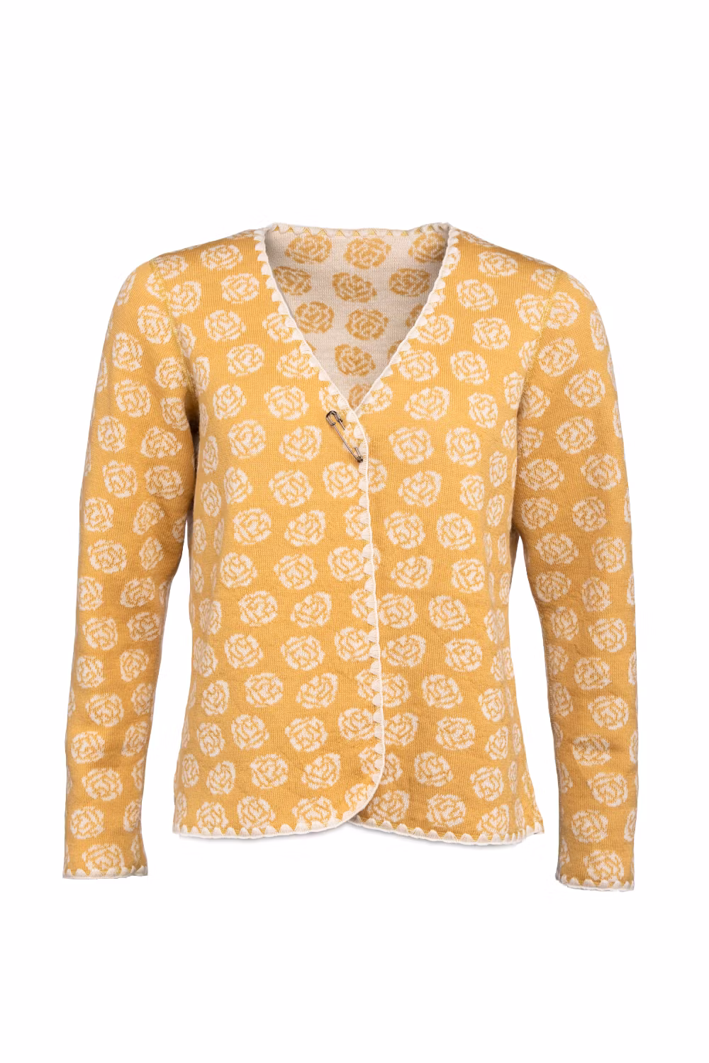 Koftan Doris i vändbar jacquardstickning. I mönstret Ros i senap / creme. 100% ull.