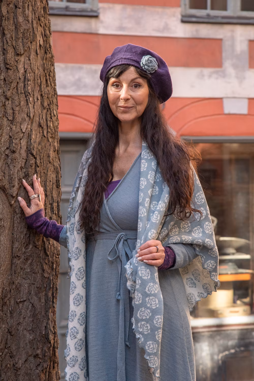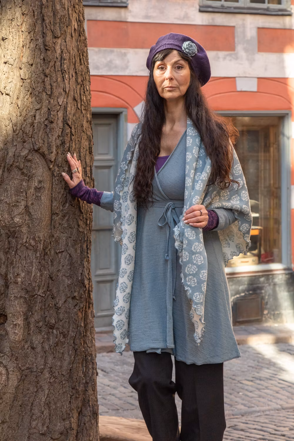 Alice lång - lätt och skön långkofta i vår tunna slätstickng. Stängs med knytband eller medföljande stor säkerhetsnål.