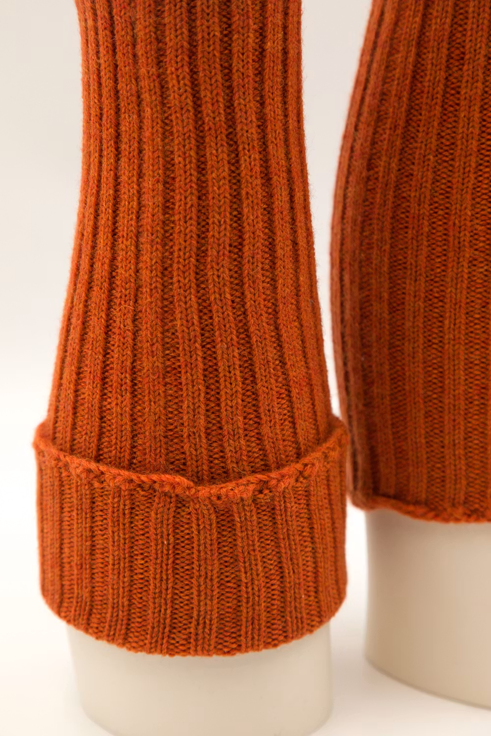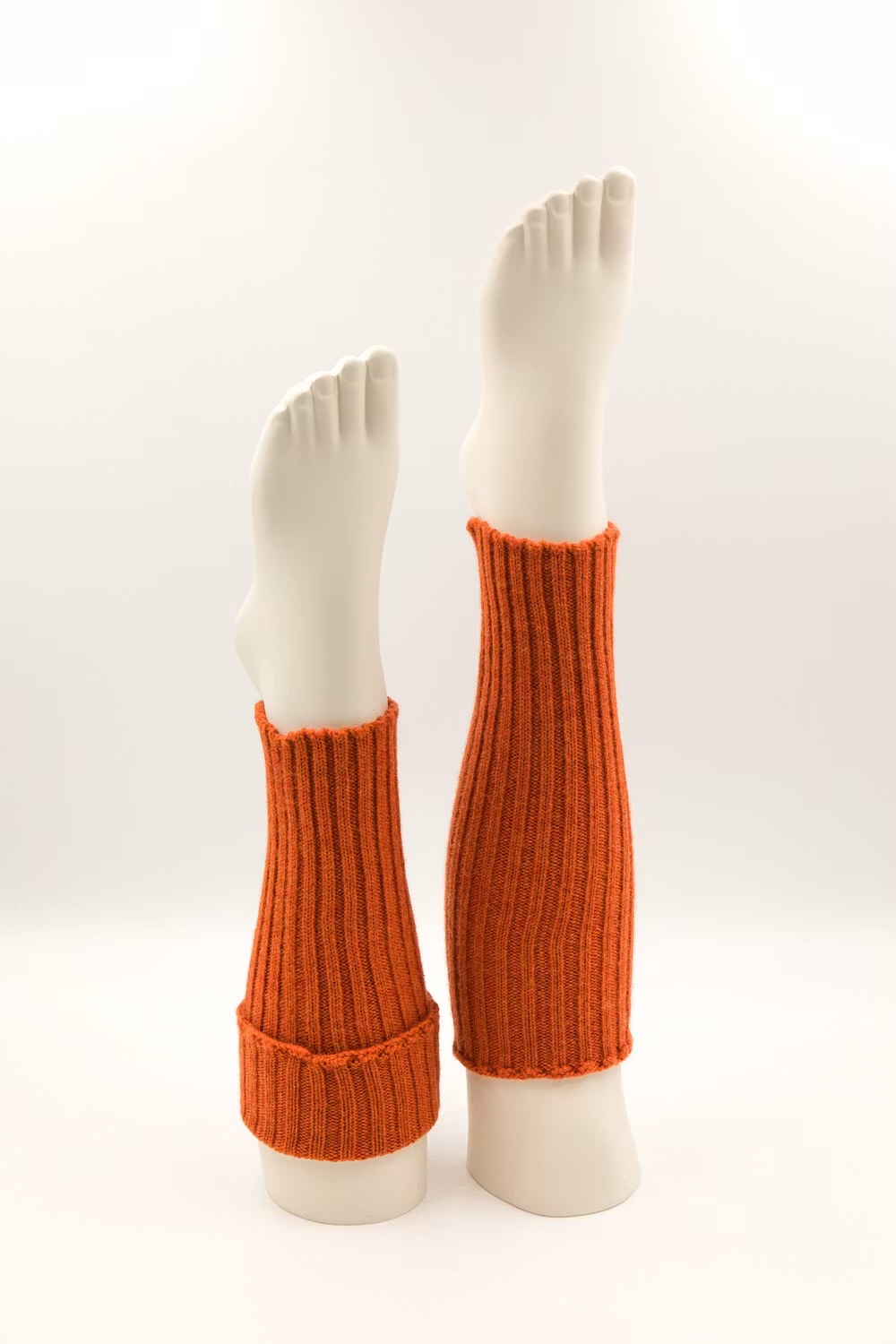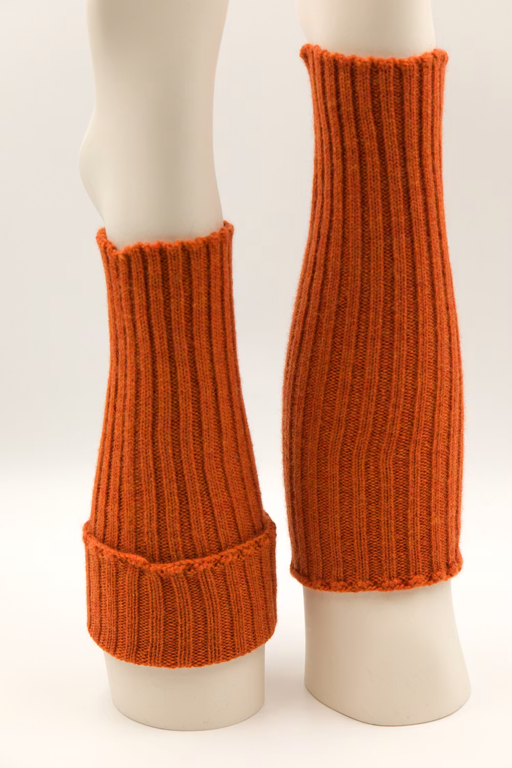 Benvärmare i rejäl ribbstickning. 100% ull, ca 35 cm långa.