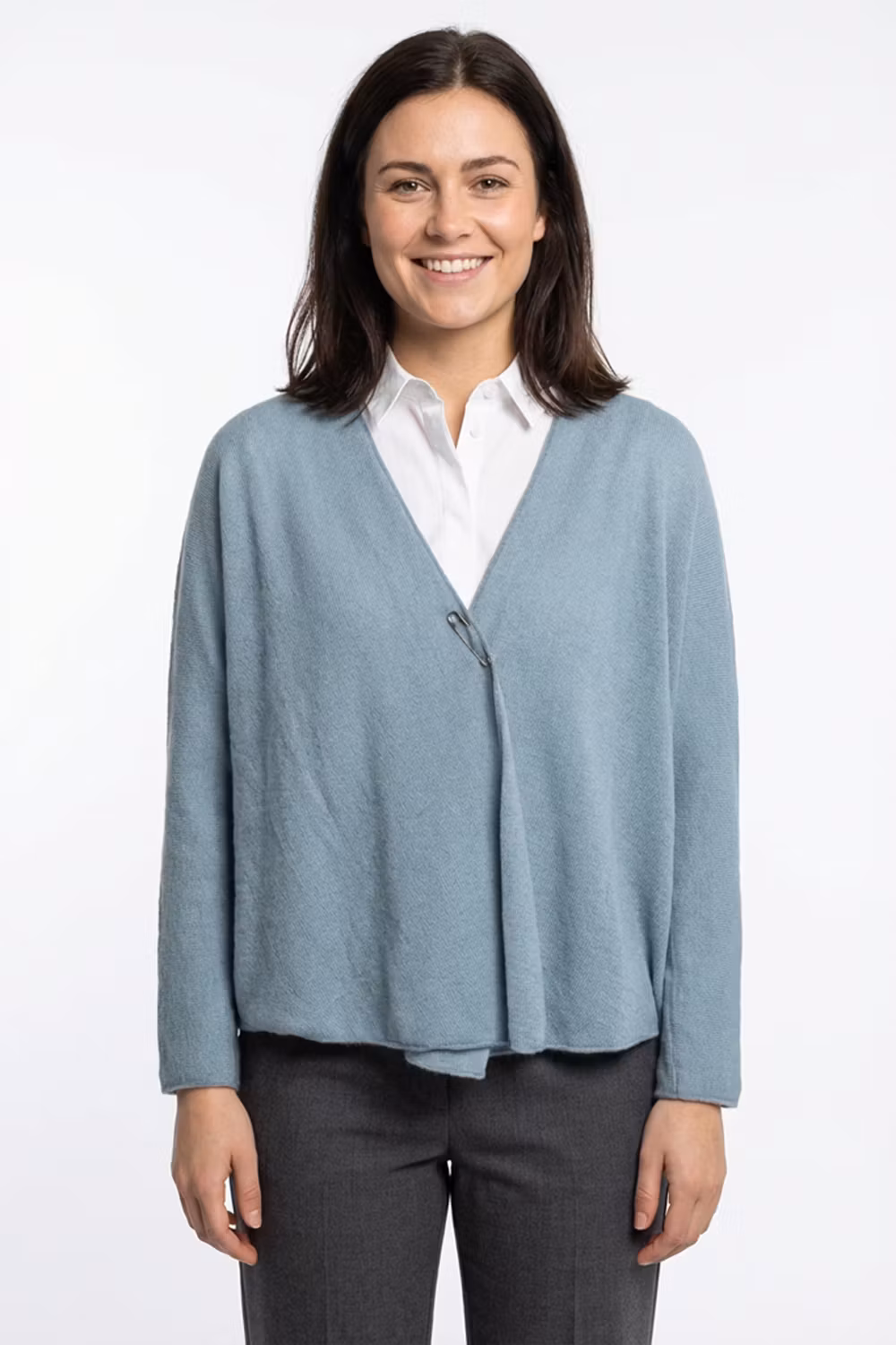 Lätt och skön kofta i vår tunna slätstickning. Stängs med medföljande stor säkerhetsnål.